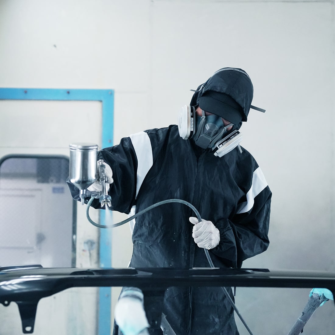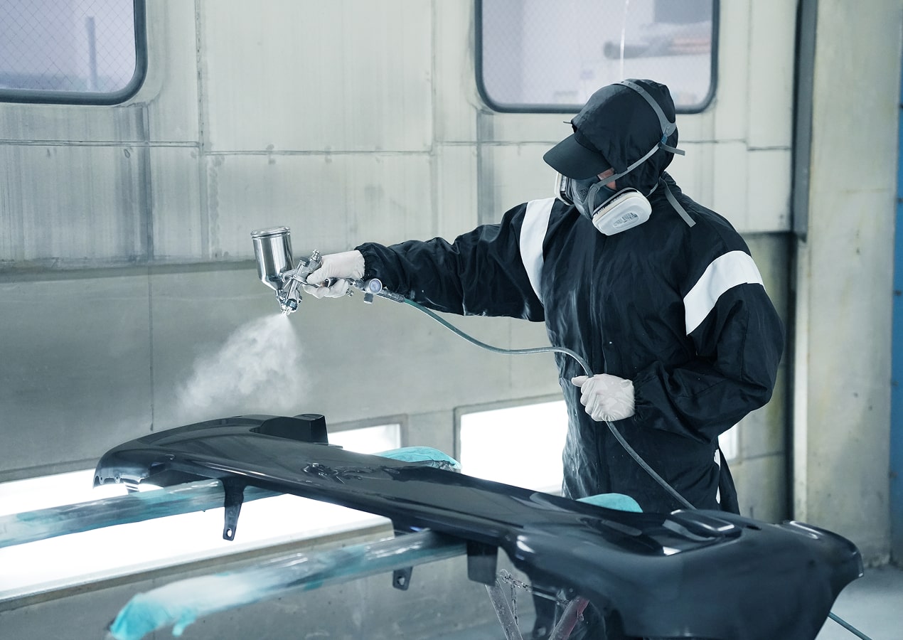 塗らない部分を適切にマスキングし、スプレーガンを使用して塗装を進めます。塗り方の指示に従い、精密に作業を行います。